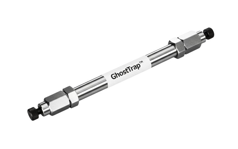 GhostTrap™ Column captures contaminants at the source by purifying the mobile phase inline before it enters the injector and analytical column.